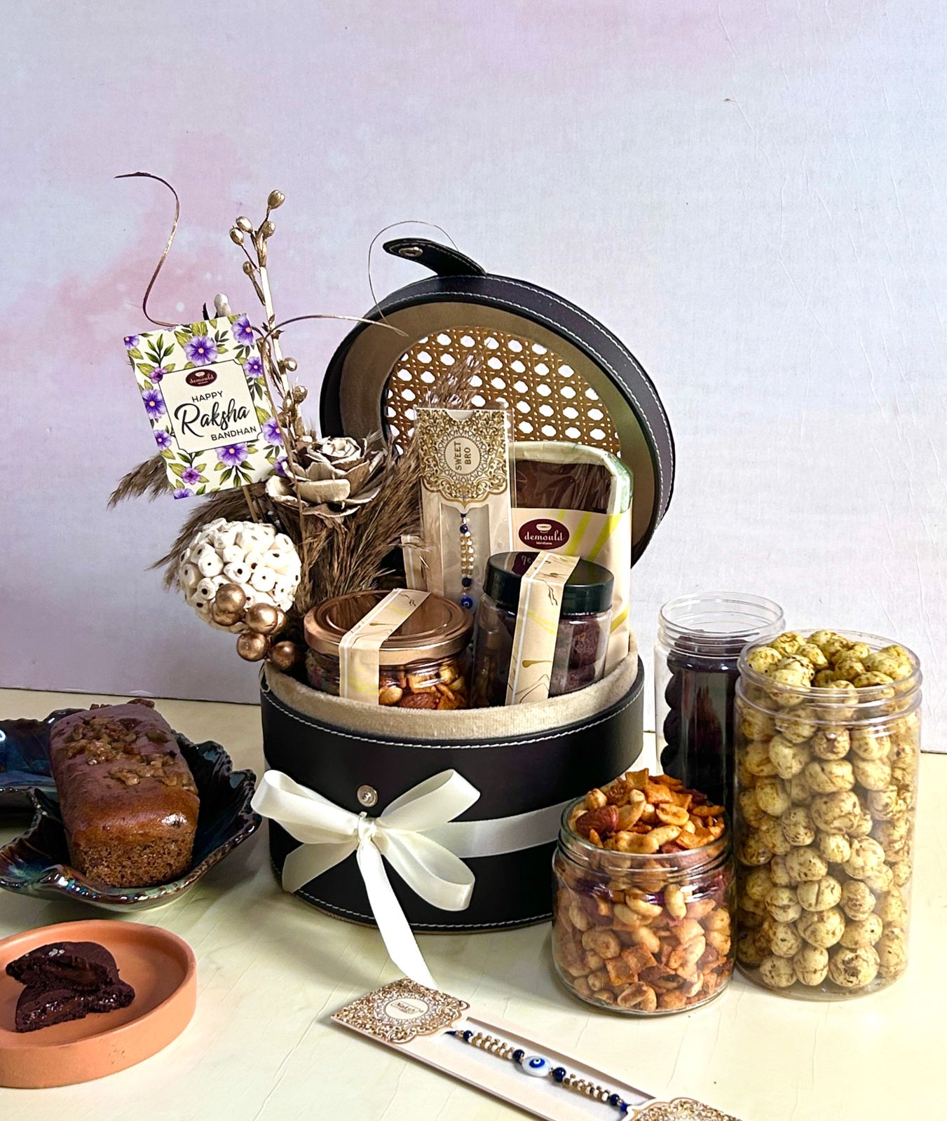 Indulge in the perfect Raksha Bandhan gift with our exquisite hamper featuring Chex Mix, Pudina Makhana, Date & Walnut Cake, and Belgian Chocolate Sea Salt Cookies. Beautifully packaged in a faux leather & rattan box adorned with dried flowers, this hamper is a delightful surprise. Celebrate the bond with the best Rakhi hamper in Delhi NCR. Order now for a Happy Raksha Bandhan!