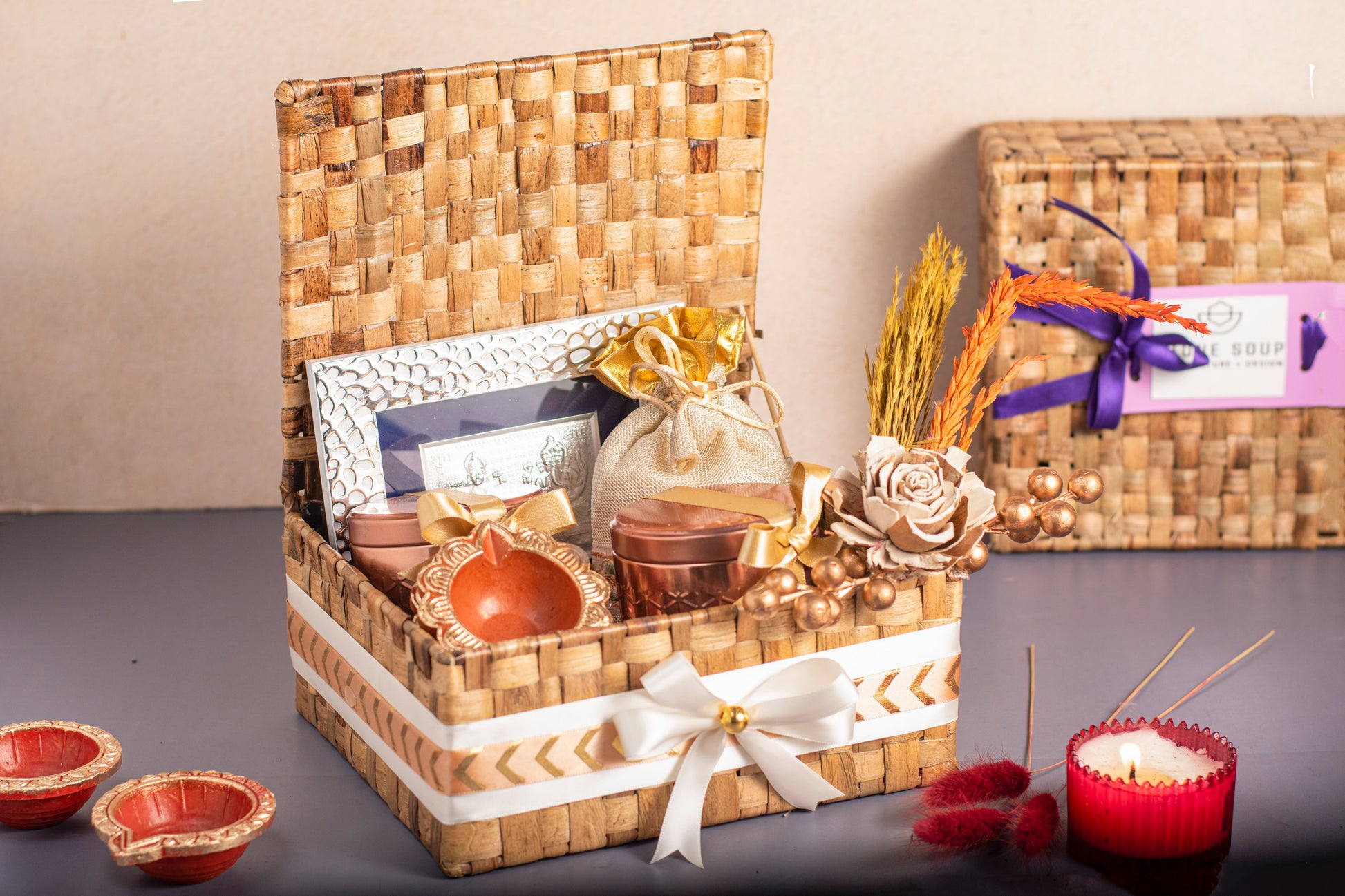 Indulge in the ultimate Diwali celebration with our ECO-FRIENDLY DIWALI GIFT BOX. Adorn your home with the exquisite Laxmi Ganesh Frame and handmade diyas, while savoring our delicious Almond Rochers and Paan Raisins. Elevate your festivities with the sophisticated jute potli and tin jars, perfect for gifting or keeping for yourself.