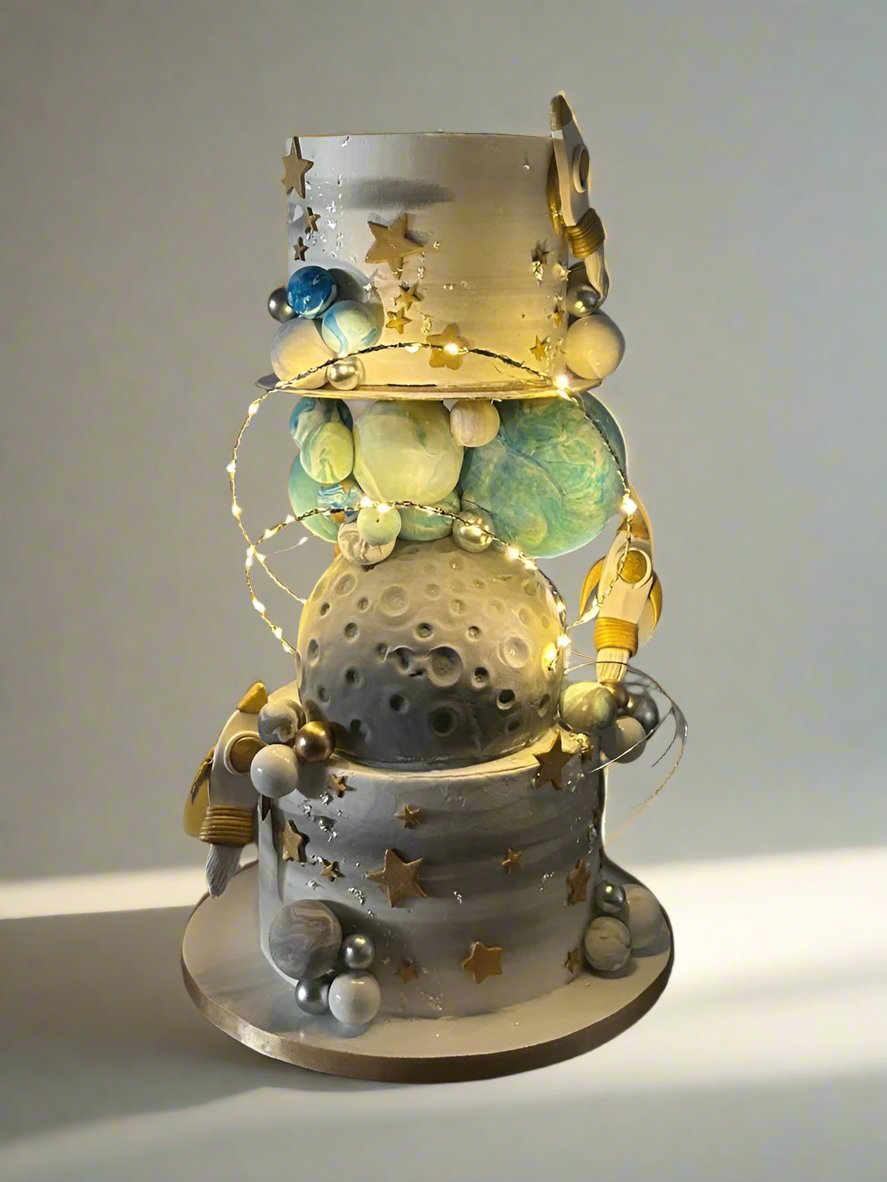 Celebrate your child's birthday with our Galactic Delight cake! Featuring a fun space theme, this cake is sure to bring joy to any young recipient. Perfect for a memorable and out-of-this-world celebration.