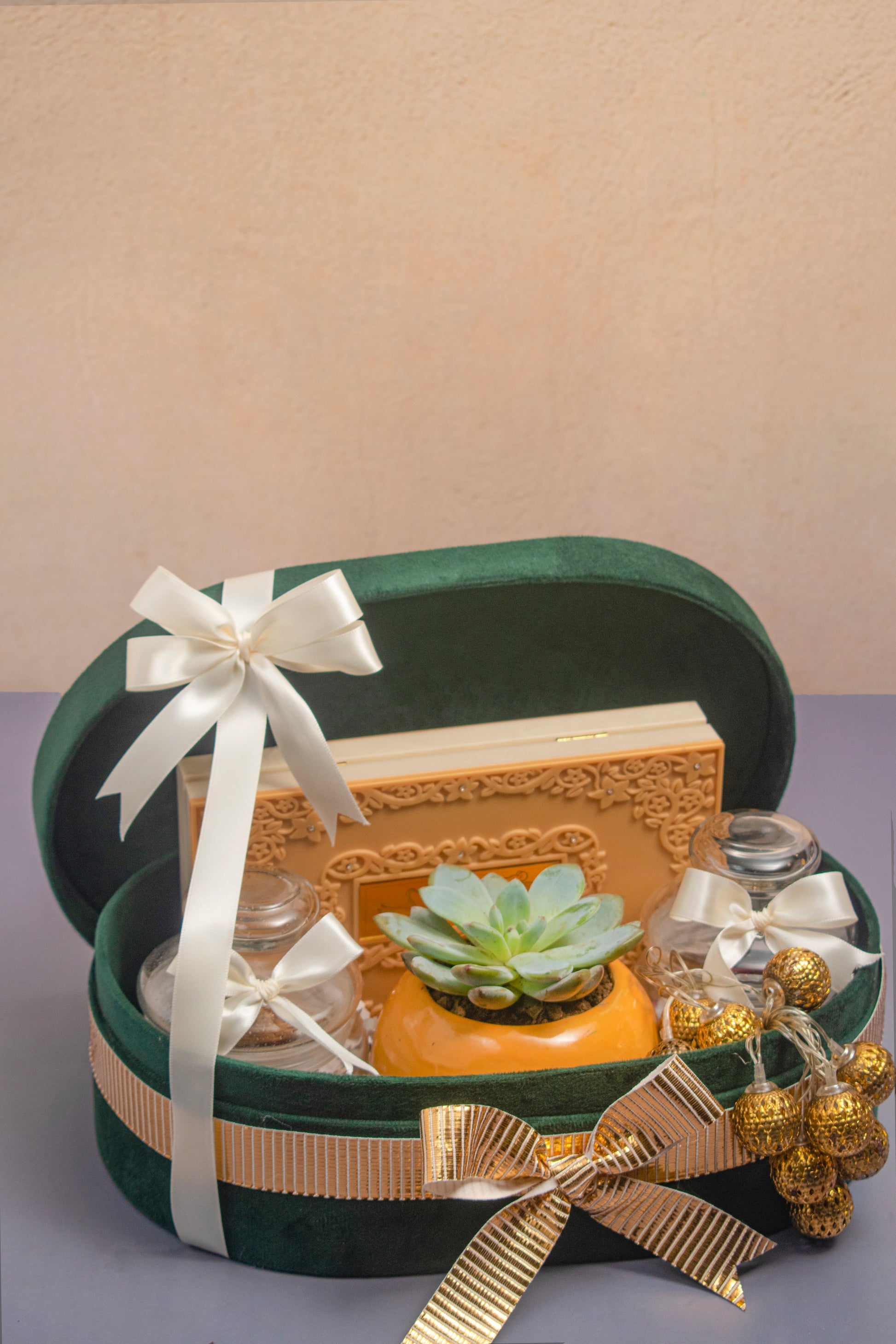 Elevate your Diwali celebrations with our luxurious Green Suede Box. Adorned with 2 pop jars, a ceramic planter, and a vibrant live succulent plant, it also features a Laxmi Ganesh Charan Paduka and a dazzling Diwali light string. Complete the indulgence with our delicious granola mix and chocolate sea salt cookies.